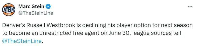 36岁威少拒绝执行25-26赛季年薪价值347万美元的球员选项,选择进入自由市场......