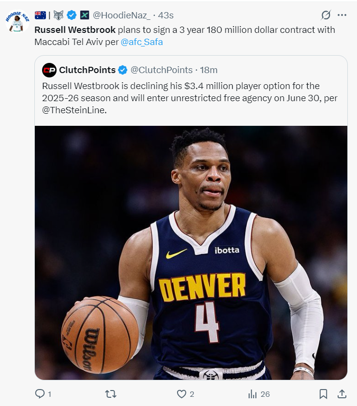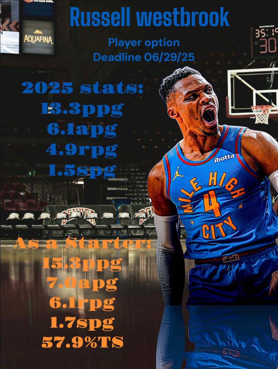 北京时间6月13日,NBA记者马克-斯坦恩透露,掘金后卫拉塞尔-威斯布鲁克拒绝执行赛季340万的球员选项,他将在7月1日成为完全自由球员涉水自由市场。
