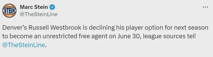 当然,威少拒绝执行球员选项,不代表他一定会离开掘金,也可能是为了签下年限更长薪资更高的新合同,不过其未来的确又变得扑朔迷离起来。