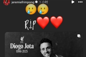 体育资讯7月4日讯 利物浦前锋若塔因车祸去世,年仅28岁。队友弗林蓬通过社媒送上悼念。