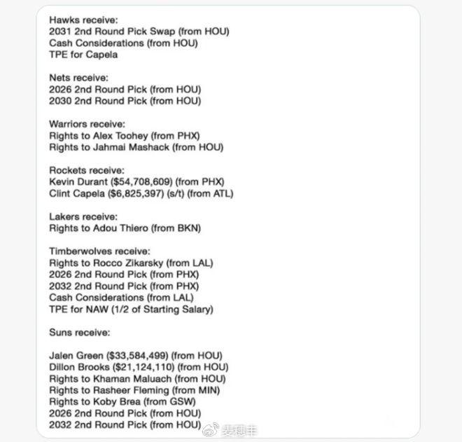 NBA目前正在休赛期,2025年的夏季自由球员市场也开启了,各支球队都在努力调整阵容,进行交易或者签约。此前已经有很多笔交易进行了,比如休斯顿火箭队就从菲尼克斯太阳队交易得到了杜兰特,又签下了卡佩拉和芬尼-史密斯,一系列的操作备受好评。但其实,这些都不是火箭队直接进行的签约,事实上是先签后换,也就是亚特兰大老鹰队先跟卡佩拉续约,洛杉矶湖人队先跟芬尼-史密斯续...