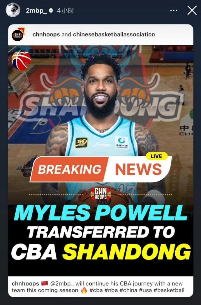 雷速体育9月6日讯 鲍威尔在个人社媒转帖宣布,自己新赛季将加盟CBA山东男篮。