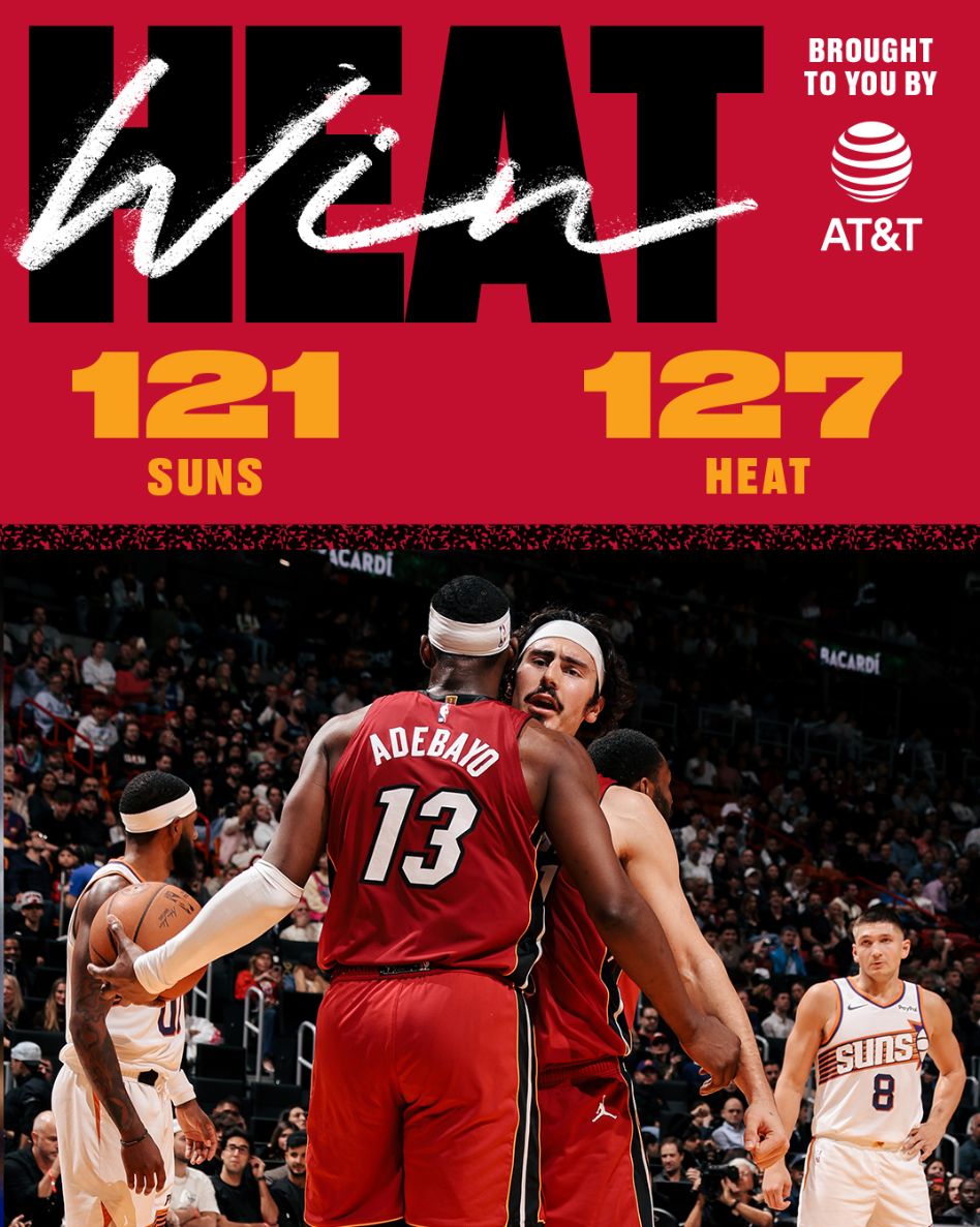 北京时间1月14日,NBA常规赛,热火以127-121险胜太阳。这场比赛是超长拉锯战,两队鏖战至最后一刻,终场前48秒鲍威尔的三分球命中才改变了局势,格雷森-阿伦三分绝平不中太阳拼下了前场篮板 ,狄龙的绝平三分继续不中还吃了一个一级恶意犯规,比赛走向完结。