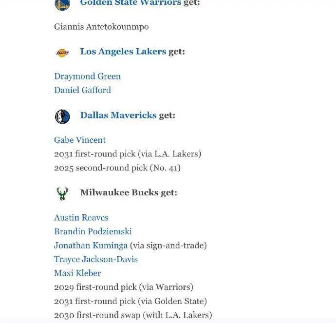 雄鹿得到:奥斯汀-里夫斯、波杰姆斯基、乔纳森-库明加、杰克逊-戴维斯、马克西-克勒贝尔、2029年首轮(来自勇士)、2031年首轮(来自勇士)、2030年首轮互换(来自湖人)