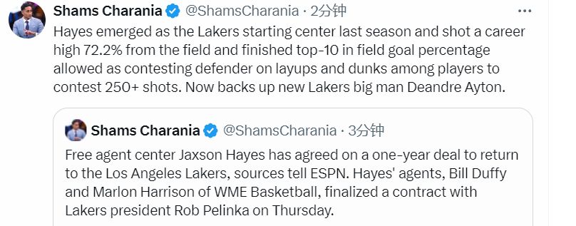 海耶斯的经纪人——WME篮球经纪公司的比尔-达菲和马龙-哈里森,于今日与湖人队总裁罗伯-佩林卡敲定了这份合同。而就在一天前,湖人队刚与自由球员中锋德安德烈-艾顿达成了一份两年合同。